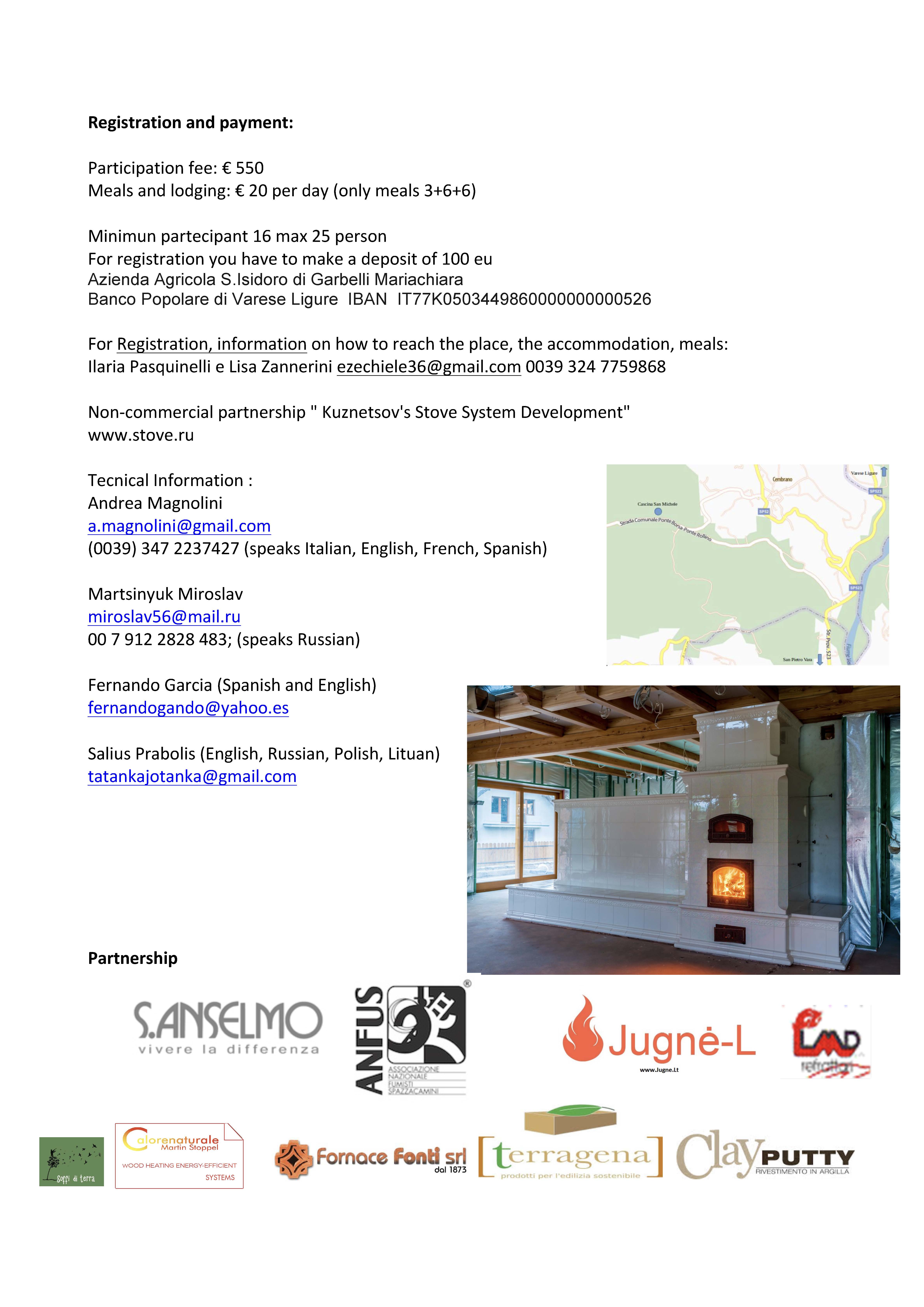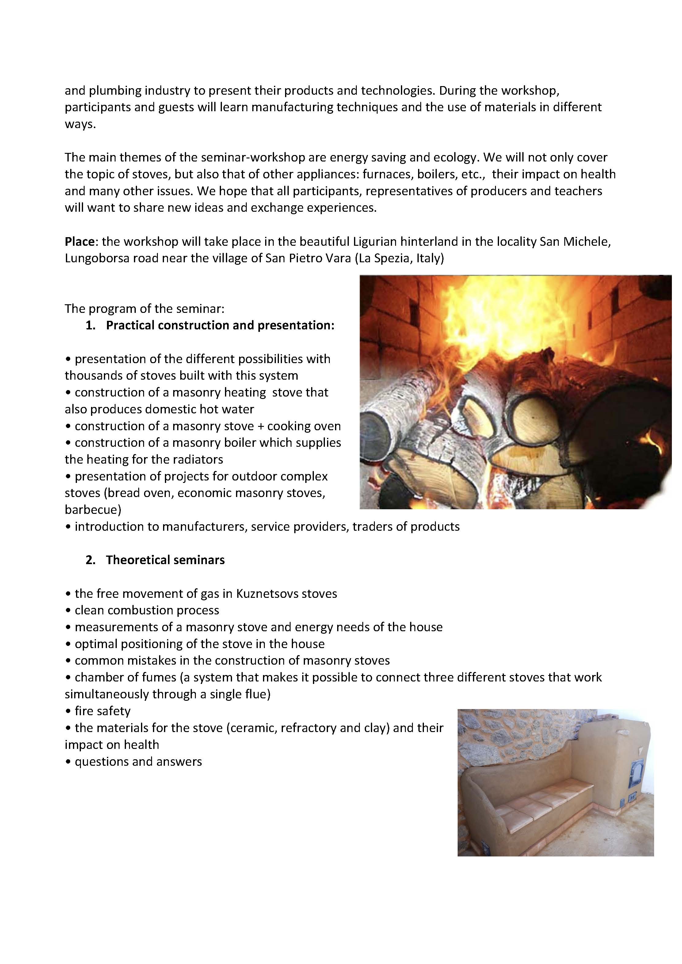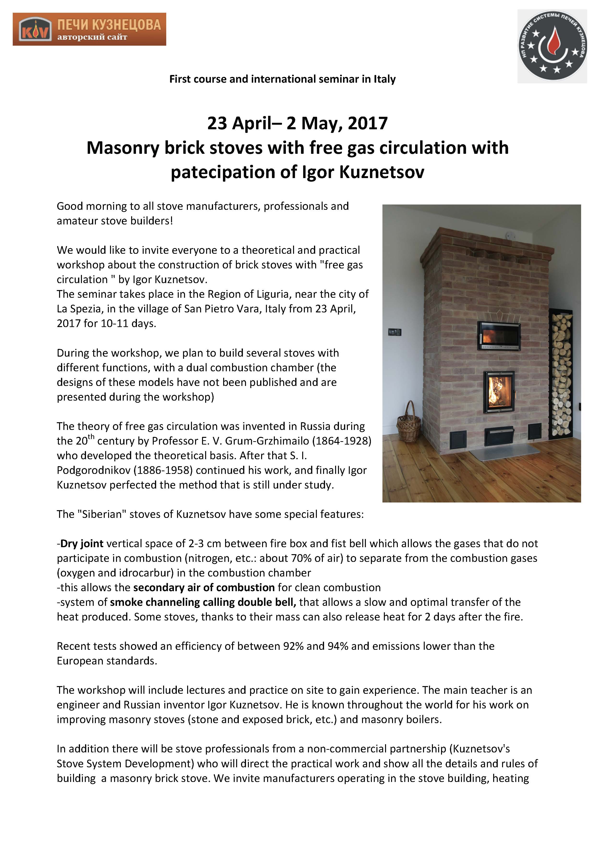 Advertisement for course on masonry brick stoves with free gas circulation, Igor Kuznetsov, Italy