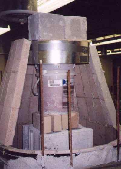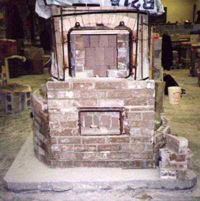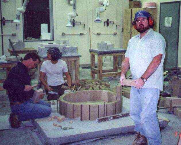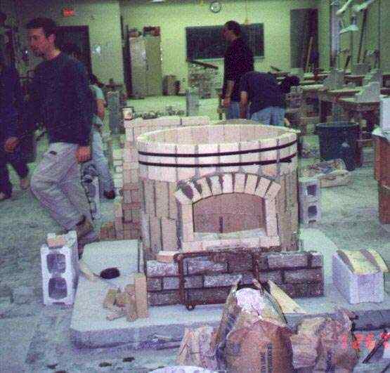 Laying out the base course of firebricks. Kiln is on a concrete skid so that it can be moved outdoors. This is Algonquin College's masonry shop. Note the limestone carving projects in behind. Instructor John McDougall is to the left.