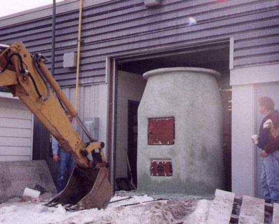 Completed kiln being skidded outdoors with a backhoe. Bottom door is for firing. Top door is for limestone.