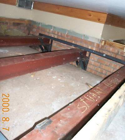 The repair consists of installing these three giant steel clamps to counteract the vault thrust at the skew course. A piece of 2"x6" steel tubing will run along the skew course on each side. Notice the nuts welded near the top of the (upside down) clamps. These will take bolts that will apply the necessary pressure to the 2x6 rails.