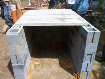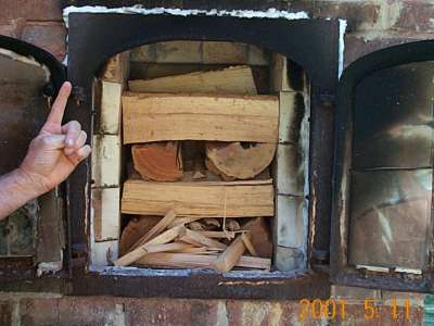We continued last year's effort to develop a database for safety testing of masonry heaters. This year we burned the 36" x 24" contraflow constructed at the workshop with 5 back-to-back loads of wood. Pat Manley is shown here documenting the second fuel load, approximately 28 pounds of dry hardwood.