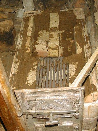 Inside of piec looking down, upper part of stove has been removed, showing fire box and behind it the smoke channels. The smoke goes up, down, up, down, and up again in the channels before going out at back.