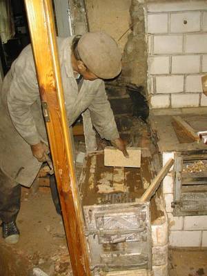 Setting a new brick in the old stove as it is rebuilt. The kitchen stove shows at the right.