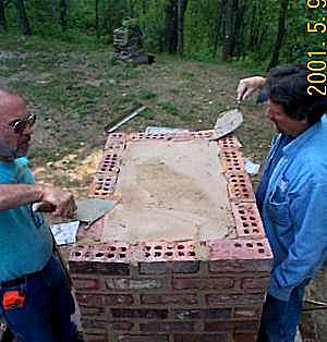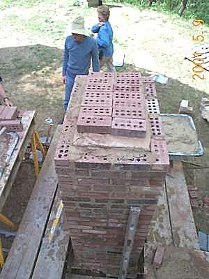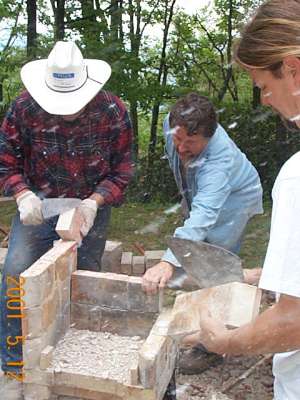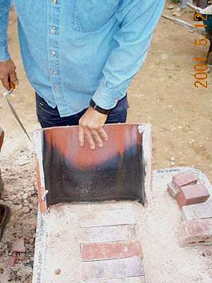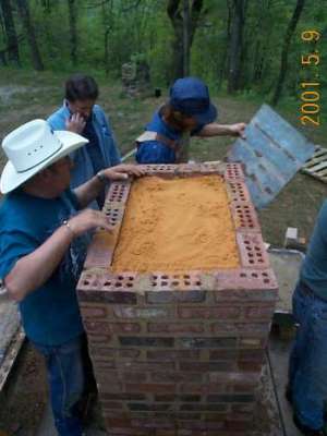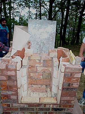 Heater base run. Downdraft channels exit to rear into an 8" round stove pipe. Triangular piece in front is to support firebox floor. Clay bricks are laid up in clay/sand (adobe) mortar.