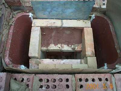 The downdraft channels are lined with clay flue liners. Cross section of downdraft heat exchange channels is 4" x 13.5". Liners were cut from standard 12" x 16" flue liners. Fiberglass rope is siliconed to the liners as to provide the primary expansion joints for the heater.