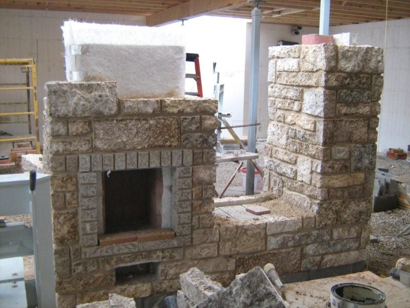 Firebox is built. Rear firebox section consists of a 2.25" firbrick on edge plus a 1.25" firebrick on edge to meet building code requirement for 8" overall wall thickness. Different expansion joint materials visible left and right.