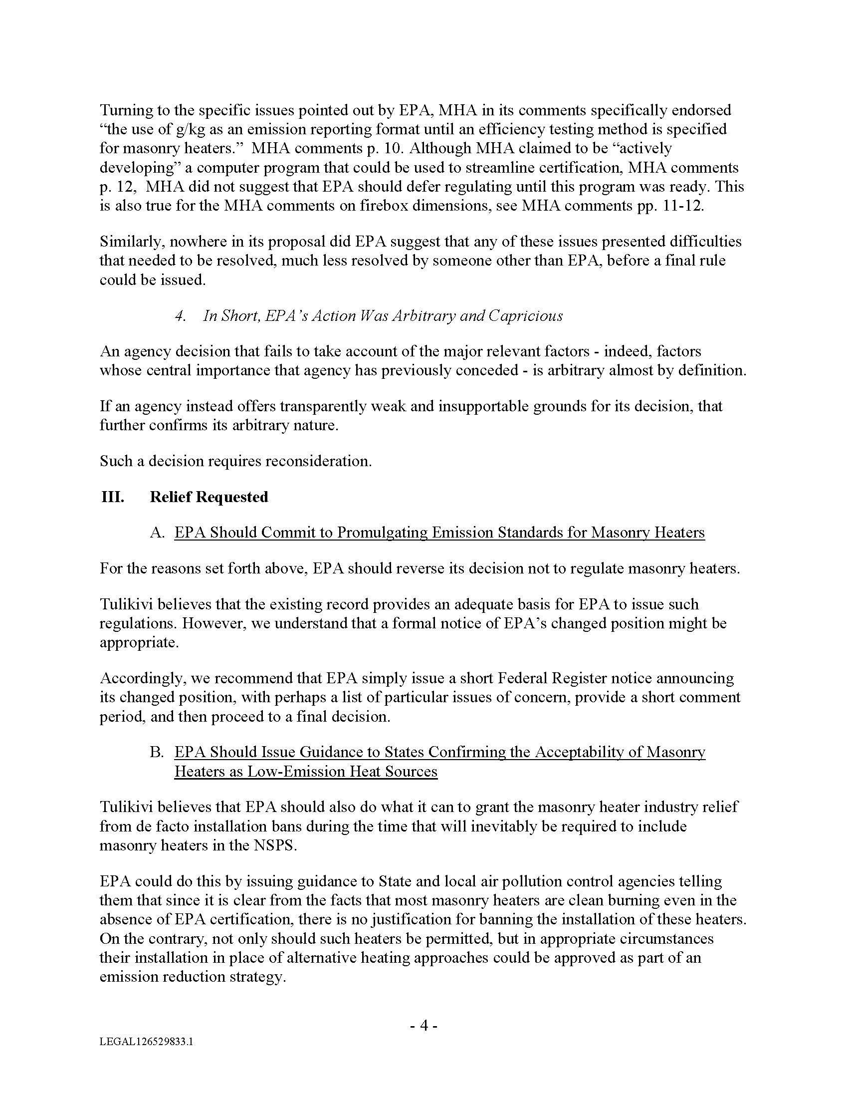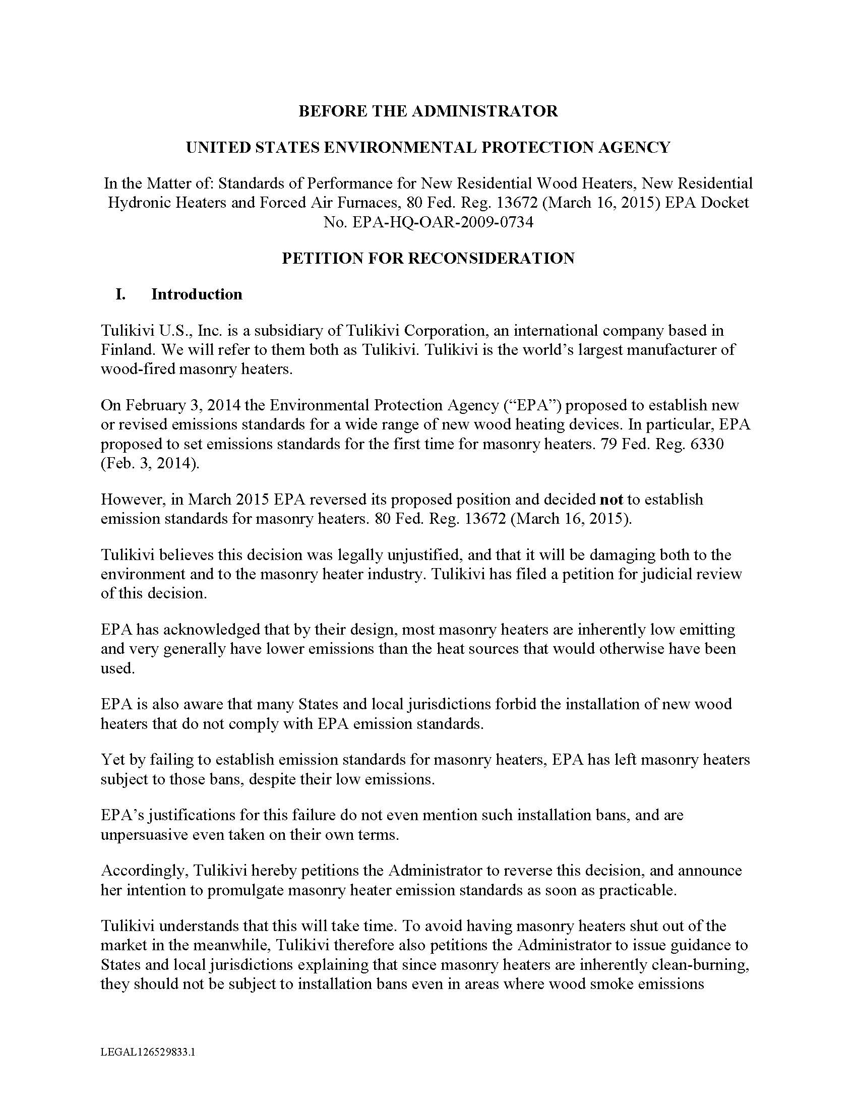 Accordingly, Tulikivi hereby petitions the Administrator to reverse this decision, and announce her intention to promulgate masonry heater emission standards as soon as practicable.