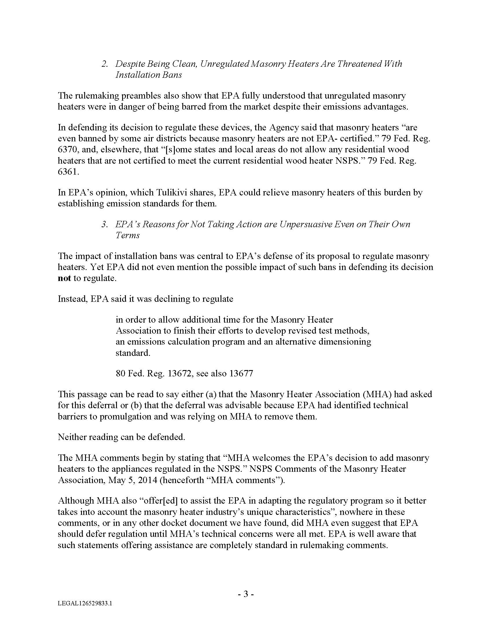 On February 3, 2014, the Environmental Protection Agency (“EPA”) proposed to establish new or revised emissions standards for a wide range of new wood heating devices. In particular, EPA proposed to set emissions standards for the first time for masonry heaters. 79 Fed. Reg. 6330 (Feb. 3, 2014).