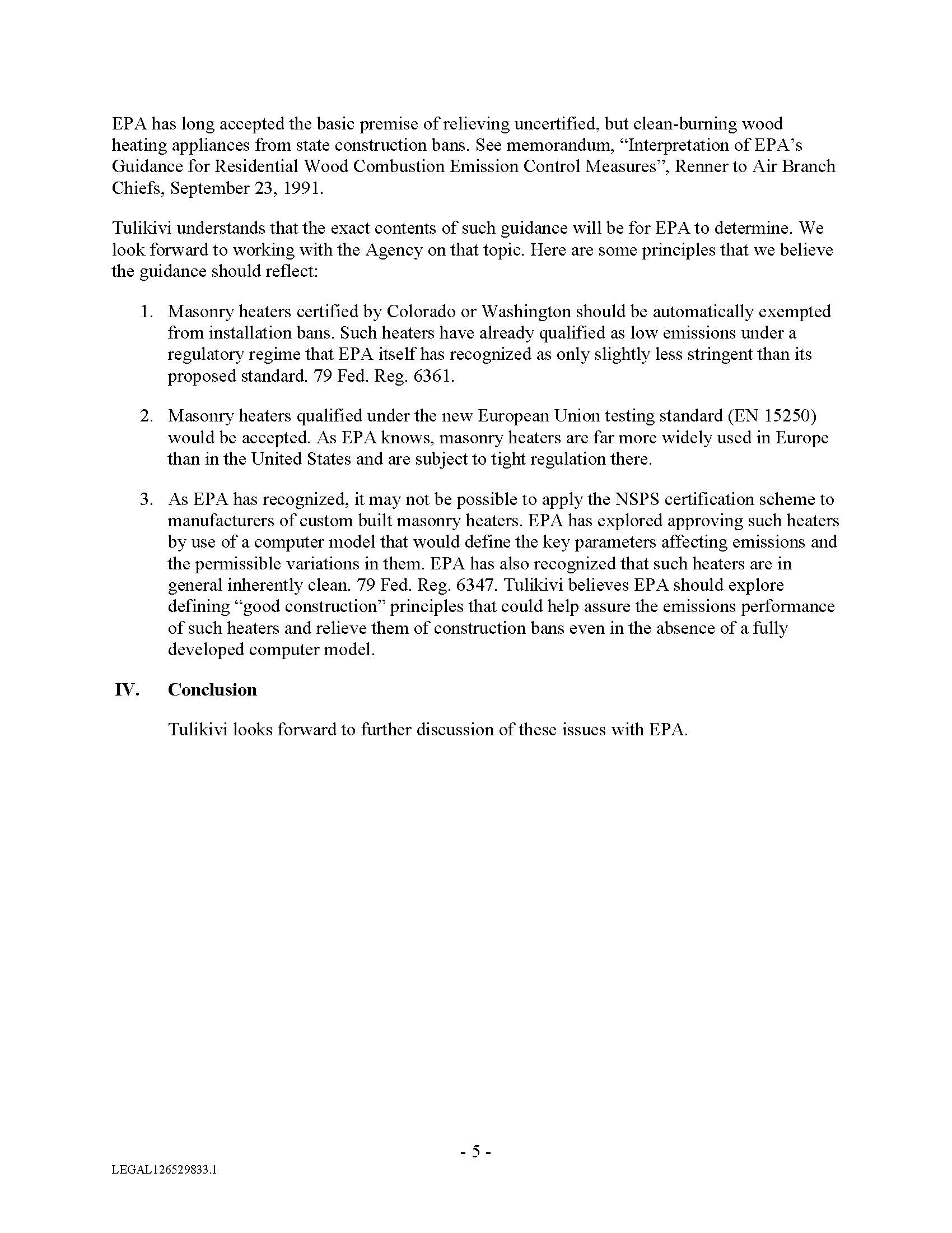 Tulikivi believes this decision was legally unjustified, and that it will be damaging both to the environment and to the masonry heater industry. Tulikivi has filed a petition for judicial review of this decision.