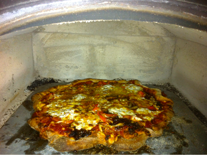 Pizza baked on a soapstone slab in a masonry heaters black bakeoven. Slab is pre-heated in front of the door and placed in oven when only after fire is in coal stage. There must be a 3x3” channel left open in the back of the oven for the hot gases to go thru the oven and into the chimney.