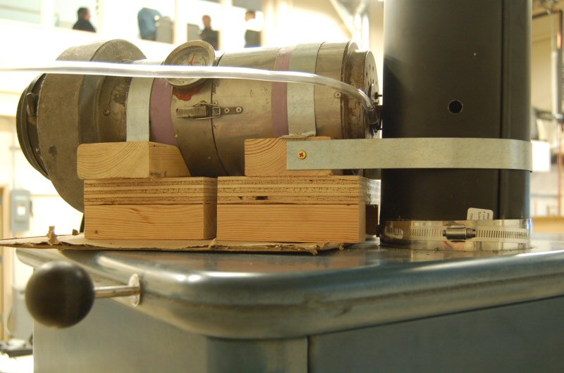 The lab lights are turned off so that we can take a time lapse photo series of the burn. Dave adjusts a motor to maintain a constant pressure (about minus 12 pascals on the Magnehelic)