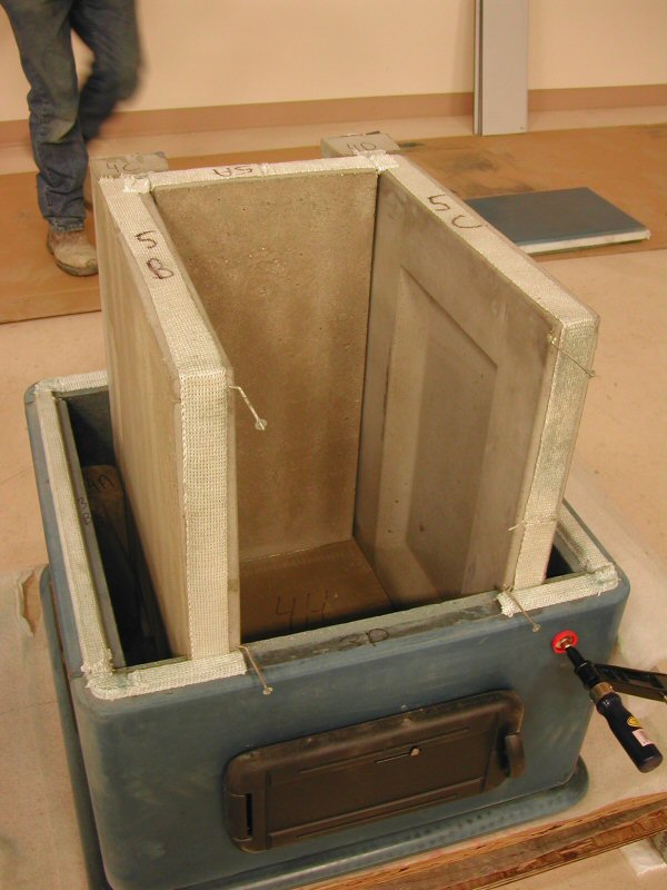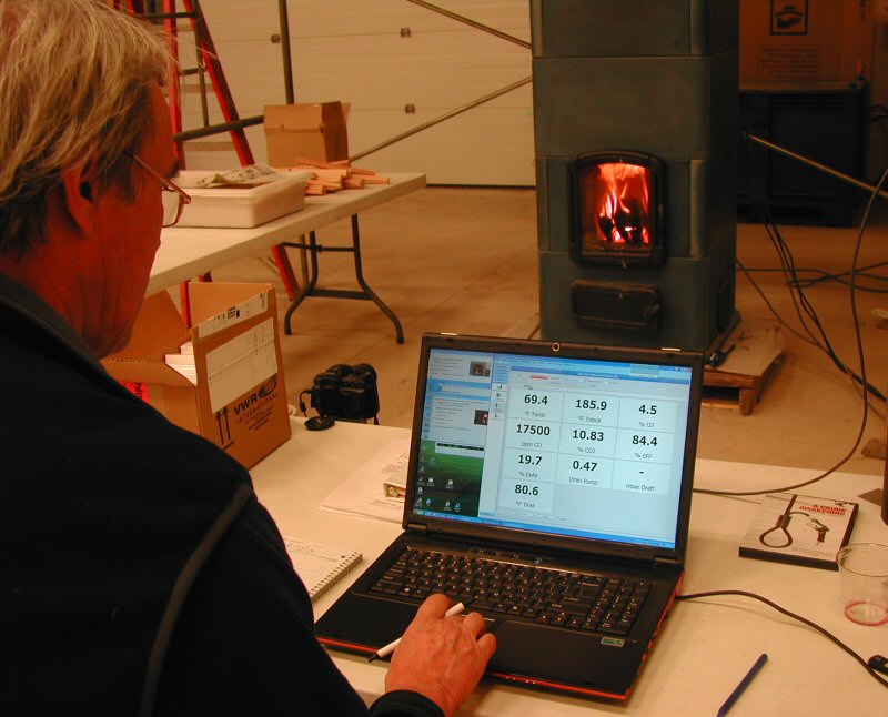 Curing with an electric heater inside the firebox. Visible at the back is an assembled Swedish Kakelugn (Royal Crown) core that Dan bought from Jerry Frisch at the 2007 MHA auction. It had a facing by the time I arrived. The Swedish was originally field tested by OMNI about 10 years ago, and recently retested by them to the new proposed ASTM standard.