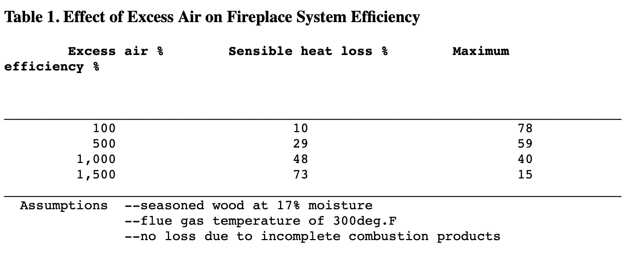 - In any combustion system, the greater the mass flow, the poorer the heat transfer from the combustion gases to the system and the higher the sensible heat loss up the chimney. Any combustion system operating at high excess air levels is inherently inefficient. Table 1 shows the effect of excess air on a wood-burning fireplace burning seasoned wood with a flue gas temperature of 300deg.F. At 100% excess air, the sensible heat loss is 10% and the maximum possible efficiency the system can have is 78%. Looking at a fireplace burning at 1500% excess air, the sensible heat loss up the chimney is a huge 73%. The best efficiency a conventional fireplace can have is only 15%. This does not even consider the other inefficiencies and heat losses described below.
