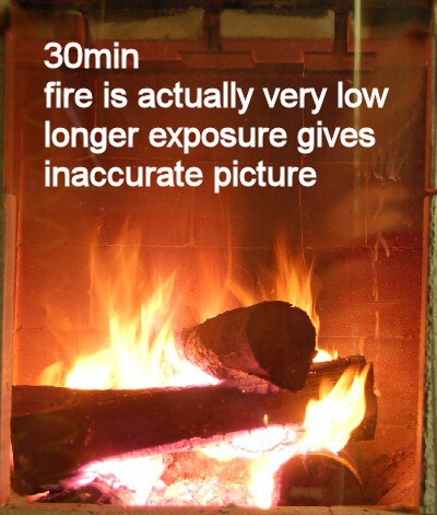 The time lapse series is still being taken with automatic exposure, which gives an unrealistic bright look to the slow parts of the fire.